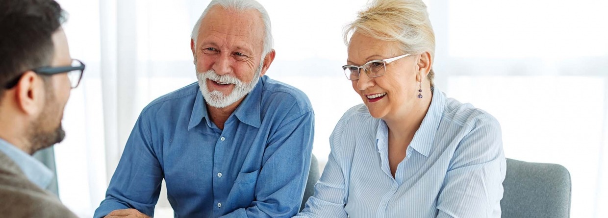 Senior stel heeft een afspraak met een adviseurt over krediet